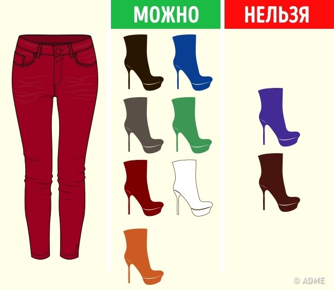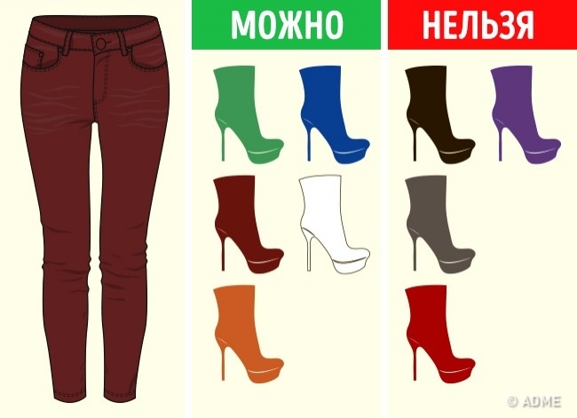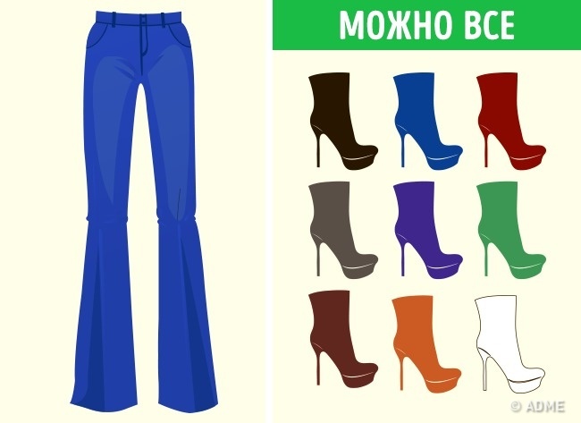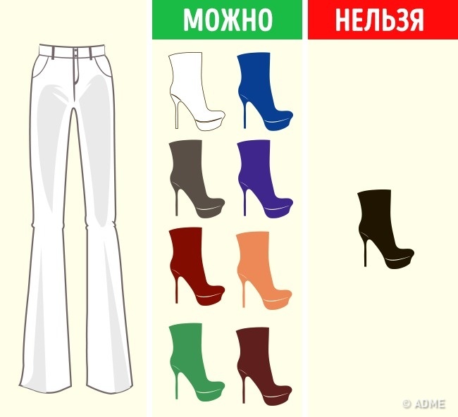 До таких штанів не підходить чорна і сіра взуття. При правильно підібраних кольорах можна носити навіть взуття бордового або зеленого кольору, але від сірого варто відмовитися назавжди.