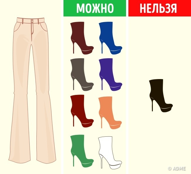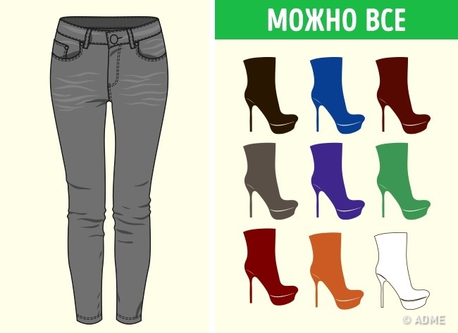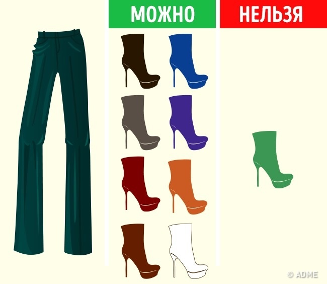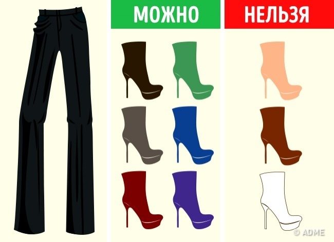 Вважається, що чорний підходить до всього. Але не все підходить до чорного. Однозначно не варто надягати білі туфлі, а також будь-коричневі відтінки. Чорний — більш діловий колір, коричневий — повсякденний. Краще вибрати щось кольорове, якщо хочеться створити цікавий образ.