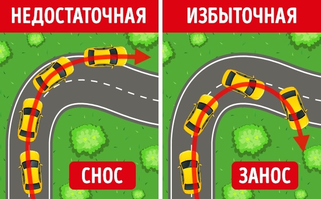 При знесенні передні колеса втрачають зчеплення з дорогою при проходженні повороту з-за перевищення швидкості. При занесенні відбувається майже те ж саме, але з задніми колесами. Якщо ви їдете по мокрій або зледенілій дорозі, не варто розганяти. Рух на прийнятній швидкості дозволить уникнути більшості випадків знесення або заносу.