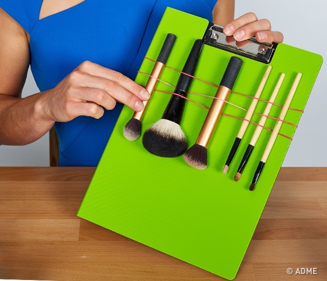 Щоб кисті для макіяжу зберігали свою форму і цілісність, їх потрібно часто мити і сушити у вертикальному положенні. Для сушіння та зберігання кистей відмінно підійде кліпборд, просто надіньте на нього канцелярські гумки і закріпіть там пензлика.