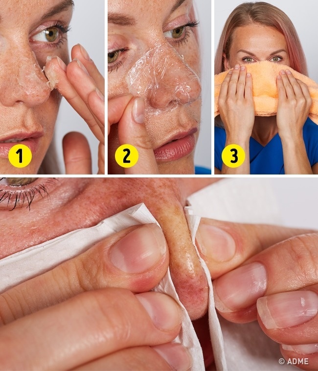 Помийте обличчя і нанесіть на чисту шкіру вазелін, потім накрийте шматочком харчової плівки, а зверху покладіть тепле вологе рушник. Через 5 хвилин приберіть рушник з плівкою і за допомогою сухих серветок натисніть на точки.