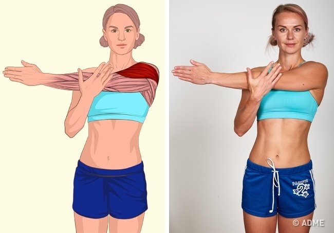 - Виконання: випряміть руку поперек тіла і злегка натисніть на неї, щоб посилити розтяжку м'язи. Повторіть вправу з іншою рукою.