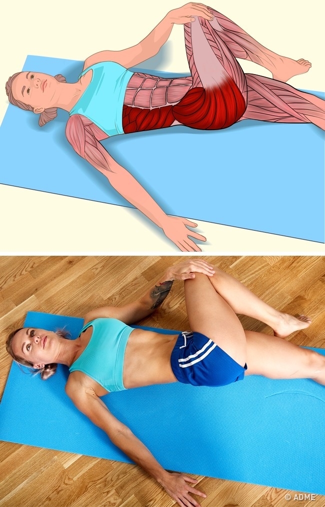 - Виконання: лежачи на підлозі, поставте праву ногу через все тіло, повільно натискаючи рукою на праве коліно, щоб розтяжка була краще. Повторіть з іншою ногою.