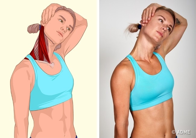 - Виконання: у положенні сидячи, випрямивши спину і допомагаючи лівою рукою, нахиліть голову вліво, намагаючись вухом торкнутися плеча. Повторіть вправу в іншу сторону.