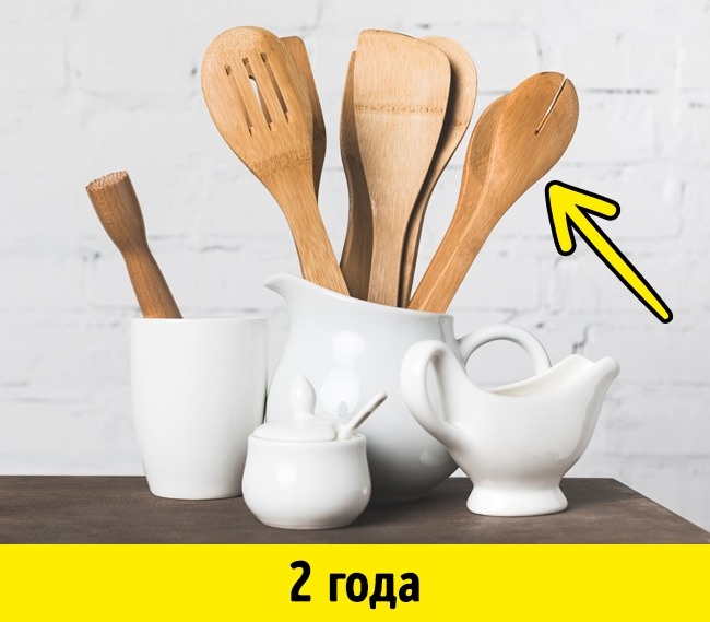Лопатки для перемішування, щипці і все начиння, яка часто стикається з їжею, необхідно міняти кожні два роки. Особливо це стосується дерев'яних кухонних інструментів.