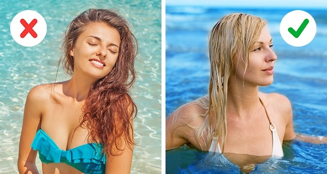 Перш ніж зануритися в море або басейн, обов'язково намочіть волосся прісною водою — вона заповнить простір між лусочками волосся. Це вірний засіб, щоб уберегти волосся від шкідливого впливу хімії в басейні або солоної морської води.