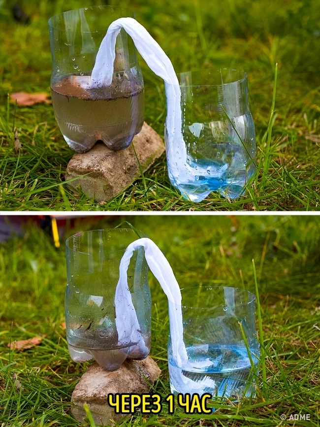 Розташуйте контейнер з брудною водою трохи вище, інший контейнер (порожній) — нижче. Відірвіть шматок одягу і опустіть один кінець тканини в брудну воду, інший — в порожню ємність. Щоб відфільтровану воду можна було з упевненістю пити, варто її прокип'ятити.