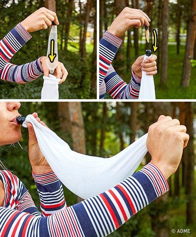 Презерватив міцний і стерильний, у критичній ситуації його можна використовувати для зберігання питної води. Примотати до неї невелику трубочку, наберіть в презерватив води і помістіть його в носок. Вийде саморобний бурдюк, який вміщує більше 1 літра води.