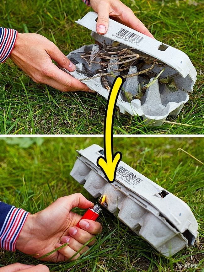 № 1. Щоб швидко розпалити багаття, покладіть гілки або вугілля в картонну коробку з-під яєць