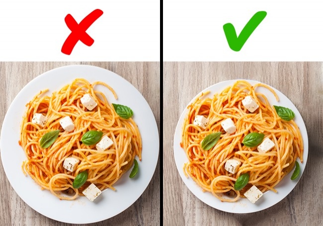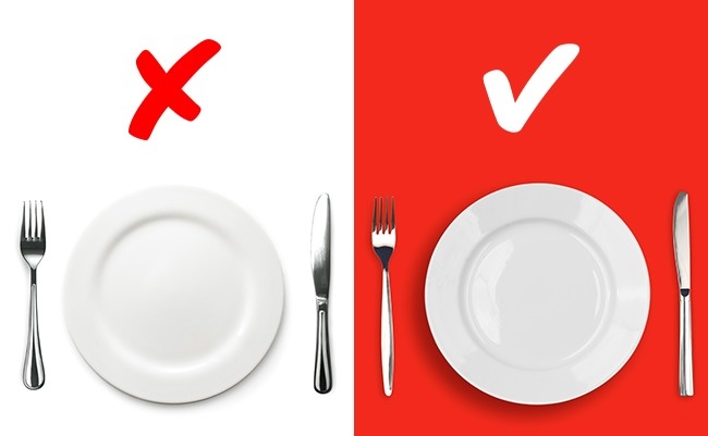 Використовуйте контрастні кольору посуду і скатертини. В даному випадку спрацює ілюзія Дельбефа. Звичайна тарілка з нормальною порцією буде виглядати великої. Вам буде здаватися, що ви їсте більше, хоча порції залишаться звичайними. В результаті ви відчуєте ситість раніше, а калорій надійде стільки ж або навіть менше.