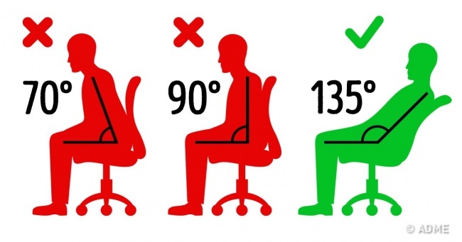 Сидіти ідеально рівною спиною майже так само небезпечно, як з викривленою. Кут нахилу, при якому всі відділи хребта відчувають меншу навантаження, становить 135 градусів.