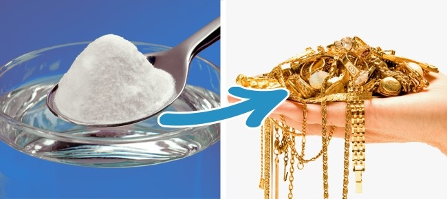 Змішайте 3 ч. л. харчової соди 1 ч. л. води і почистіть ваші коштовності з допомогою зубної щітки, а потім промийте холодною водою.