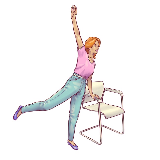 - Встаньте позаду стільця і лівою рукою зіпріться про його спинку або підлокітник.