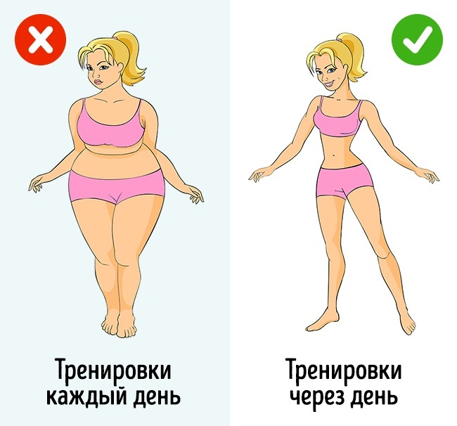 Регулярні тренування і правильне харчування — шлях до стрункого тіла. Але регулярні не означає щоденні. У цьому випадку вас чекає постійна втома, до того ж, в організмі збільшиться рівень гормону кортизолу, який може призвести до набору зайвої ваги. Щоб уникнути цього, робіть перерви між тренуваннями, висипайтеся і повноцінно харчуйтеся.