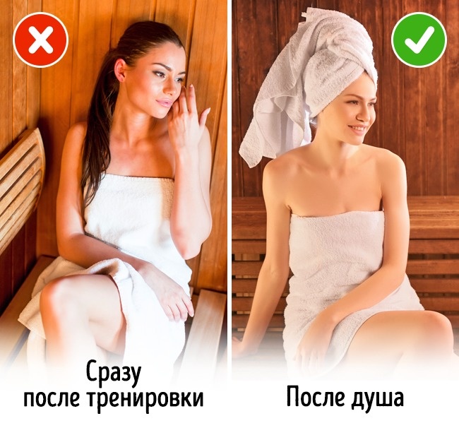 Після інтенсивної роботи в залі не варто відразу йти в лазню або сауну. Під час тренування втрачається багато рідини, а тиск підвищується. В результаті похід в сауну може обернутися поганим самопочуттям або навіть непритомністю. Перед тим як попаритися, краще попийте води і сходіть в душ.
