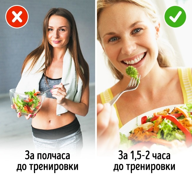 Тренування на голодний або повний шлунок — погана ідея. У такій ситуації є великий шанс, що ви просто не зможете закінчити з-за втоми і нездужань. Оптимальний варіант — поїсти за 2 години до походу у спортзал. Це запорука вдалої і продуктивної тренування.