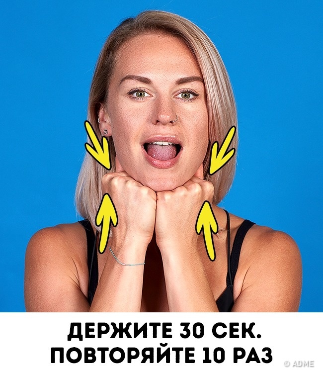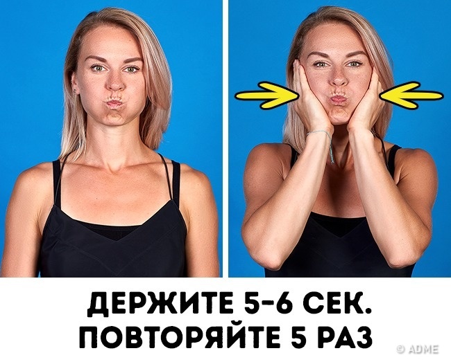 Глибоко вдихніть, щільно зімкніть губи і надуйте щоки. Покладіть долоні на щоки так, щоб пальці лягли на вуха. Тепер починайте тиснути на щоки, створюючи опір і напружуючи м'язи. Докладаючи максимум зусиль, тримайте так 5-6 секунд, потім розслабтеся і відпочиньте. Повторіть вправу 5-6 разів.