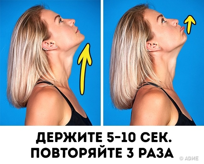 Сядьте на стілець і закиньте голову назад. Тепер уявіть, що вам потрібно дотягнутися нижньою губою до лампочки. Як можна сильніше оттопырьте нижню губу і затримайтеся в такому положенні на 5-10 секунд. Потім розслабтеся і повторіть ще 2-3 рази.