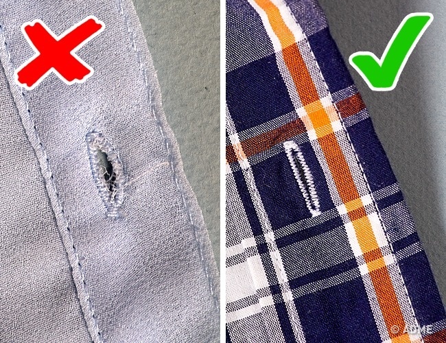 При виробництві підробки або неякісної речі часто не звертають уваги на дрібні деталі. Тому перед покупкою обов'язково огляньте гудзики і петлі. Переконайтеся, що надійно пришиті гудзики, а нитки не стирчать. Отвори повинні бути щільно обметаны і акуратно, з рівним швом, прорізані.