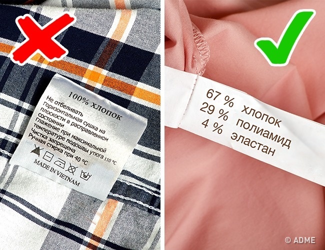Натуральні тканини, такі як бавовна, шовк і вовна, — міцні і краще протистоять зносу, ніж синтетичні. Але 100 % бавовна може швидко сідати після прання. Тому варто вибирати одяг з домішкою (5-30 %) штучних тканин (віскоза, поліестер, нейлон тощо). Такі речі не витягнуться і прослужать вам набагато довше.