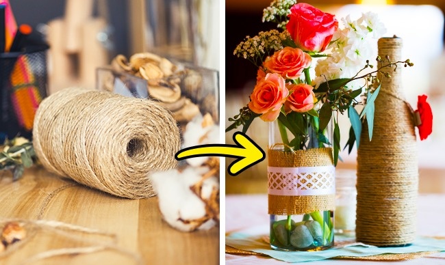Джутова мотузка дуже стильно перетворює навіть звичайні банки та пляшки. Закріпіть кінець шнура клеєм, акуратно обмотайте банку, закріпіть кінець. Готово!