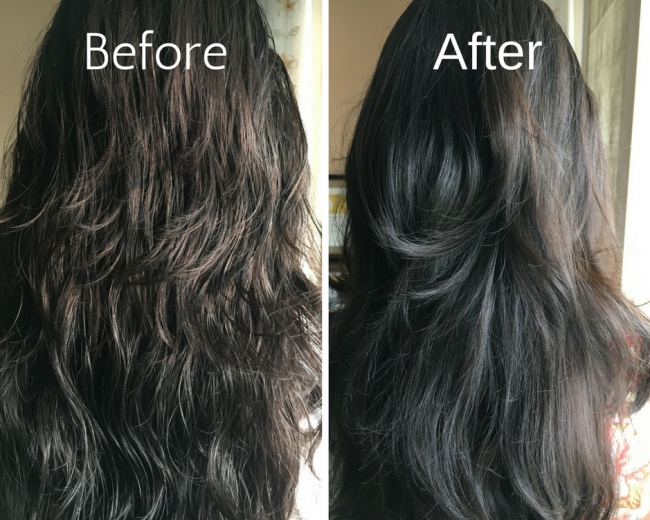 Результат: На цій фотографії результат застосування маски для волосся з медом, бананом, сиром і кокосовим маслом, яка робить волосся м'якше, щільніше, відмінно живить і додає блиск.