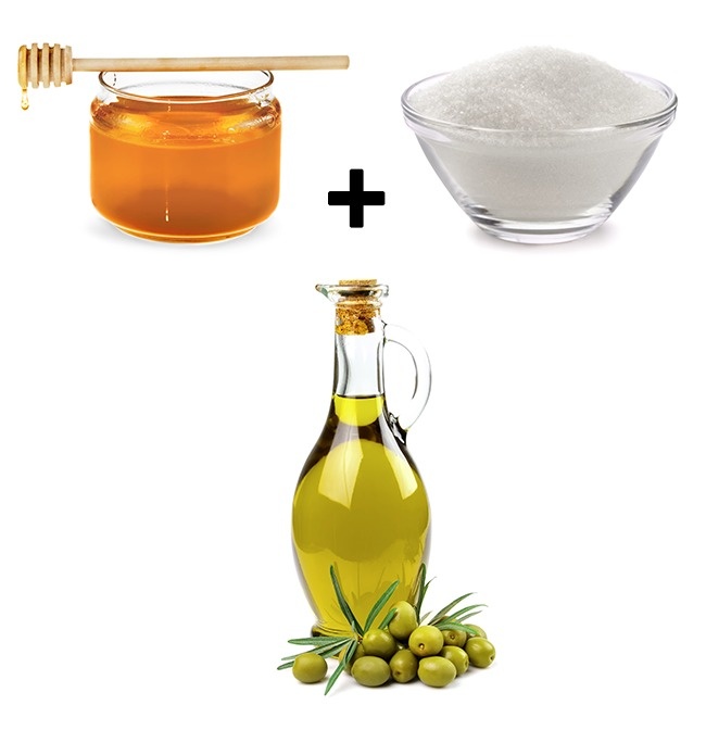 Змішайте мед, цукор і оливкове масло, як слід помасажуйте губи, змийте і нанесіть живильний бальзам. Як альтернативу можна використовувати коричневий цукор, мед і вазелін.