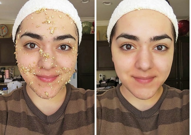 Результат: Дівчина на фотографії рекомендує використовувати скраб з медом, вівсяними пластівцями, зеленим чаєм і водою людям з будь-якими типами шкіри для відлущування, вирівнювання кольору шкіри, регенерації.