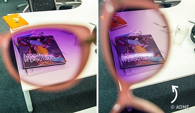 Якщо окуляри повертати, то під певним кутом блик буде зникати і з'являтися знову.