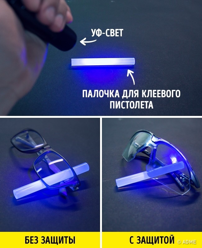 Візьміть УФ-ліхтарик і посвітіть їм через лінзу очок на будь-флюоресцентний предмет. Це може бути ковпачок від ручки, навушники, фломастер або стікери. Чим краще окуляри відсівають ультрафіолет, тим менше буде світитися предмет.