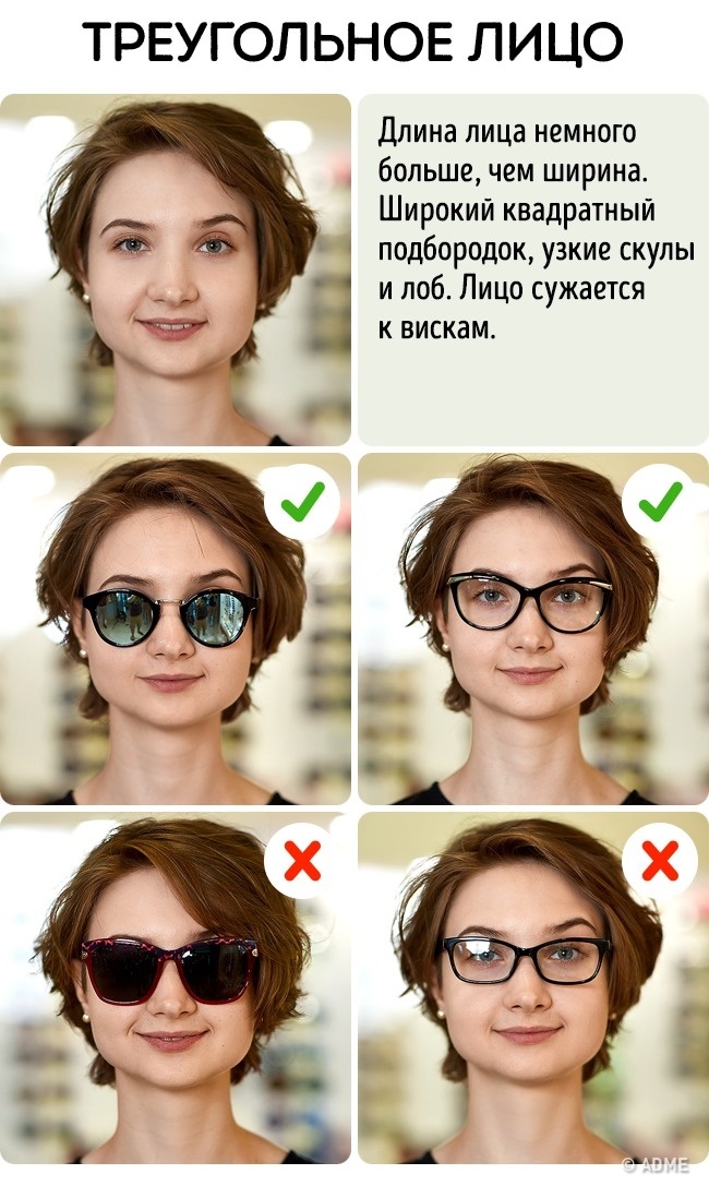 Головне завдання — розширити верхню частину обличчя і відвернути увагу від нижньої. Вибирайте окуляри з великою оправою і широкою верхньою частиною. Нижня частина окулярів не повинна бути квадратної, гострої або з чіткою лінією.