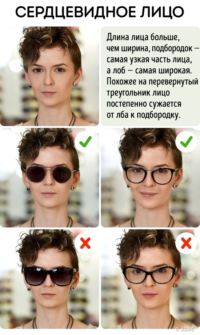 Завдання — збалансувати верхню частину обличчя, утяжелив нижню. Масивні ще більше обтяжать гору, нам цього не треба. Вибирайте окуляри, ширина яких дорівнює ширині особи, краще краплеподібні. «Авіатори» ідеально підходять.