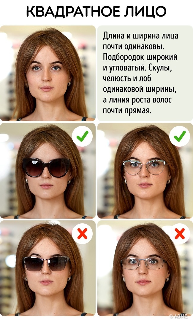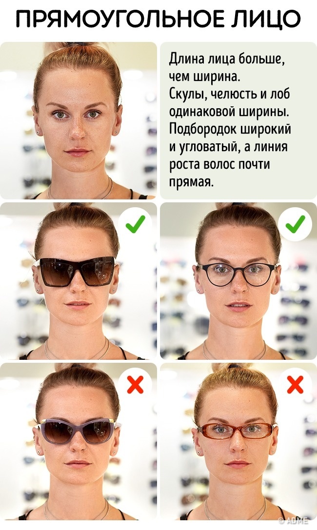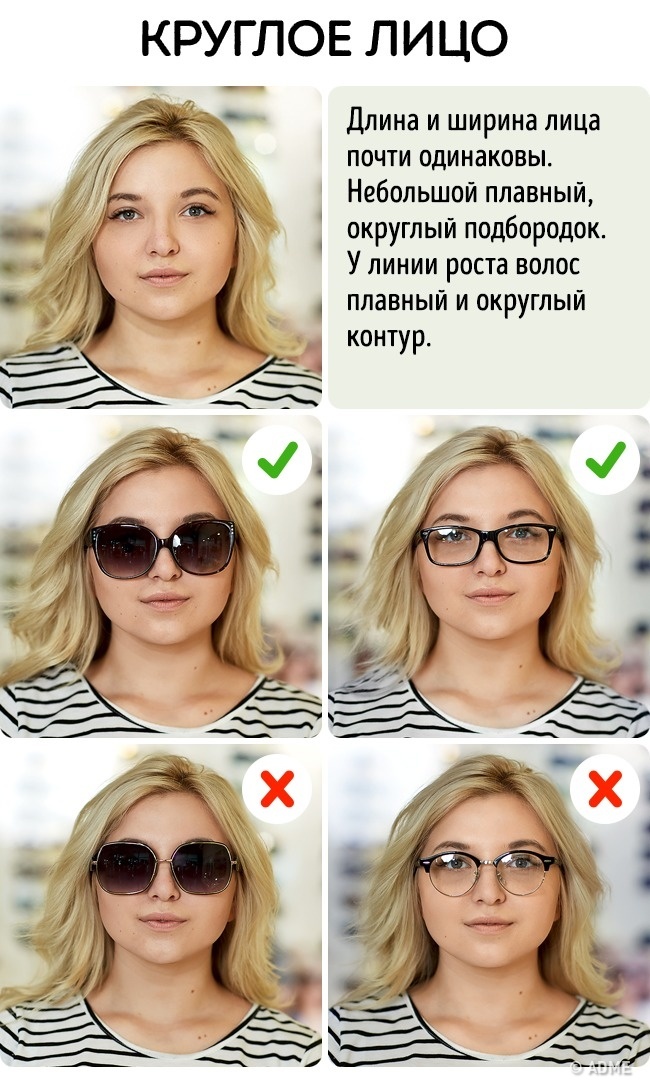Головне завдання — не порушувати гармонійні пропорції обличчя, тому уникайте занадто масивних окулярів. Краще, якщо ширина оправи дорівнює ширині особи або трохи ширше. Звертайте увагу, щоб верхня частина оправи збігалася з лінією брів.
