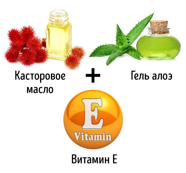 За допомогою цієї суміші можна відновити волоски, зміцнити їх і додати блиск. Змішайте в контейнері 1 ч. л. гелю алое, 2 ч. л. касторової олії і 2 капсули вітаміну Е. Наносьте суміш щіточкою або пальцями перед сном і змивайте після пробудження.