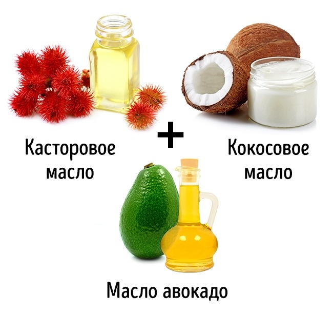 За допомогою цього рецепта можна не тільки зміцнити і відростити брови, але й вії. Змішайте в невеликій пляшечці рівні частини кокосового і касторової олій і додайте 1 ч. л. олії авокадо, змішайте. Наносьте суміш на брови за допомогою щіточки від туші або пальцями.