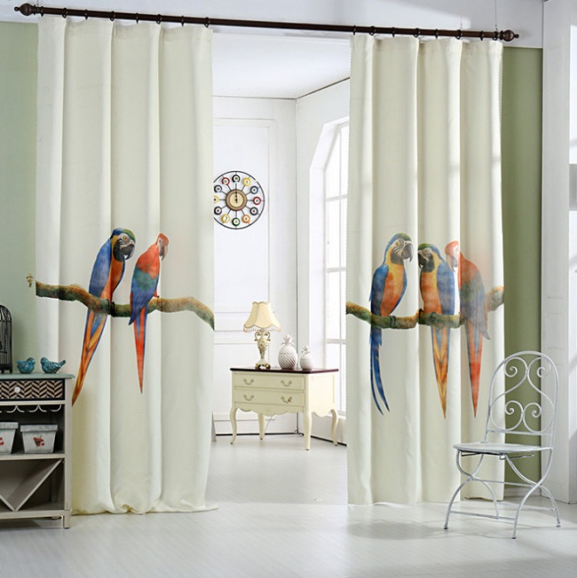 Якщо ви замислюєтеся про те, щоб відокремити частину великої кімнати стіною, для початку можна спробувати перегородки або штори. Знайти такі ж з яскравими пернатими можна тут.