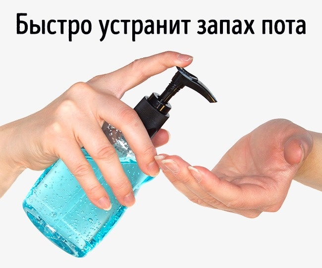 Якщо запах поту вже з'явився, а прийняти душ можливості немає, ретельно протріть пахви вологими серветками і нанесіть антибактеріальний гель для рук — він вб'є бактерії, які викликають запах.