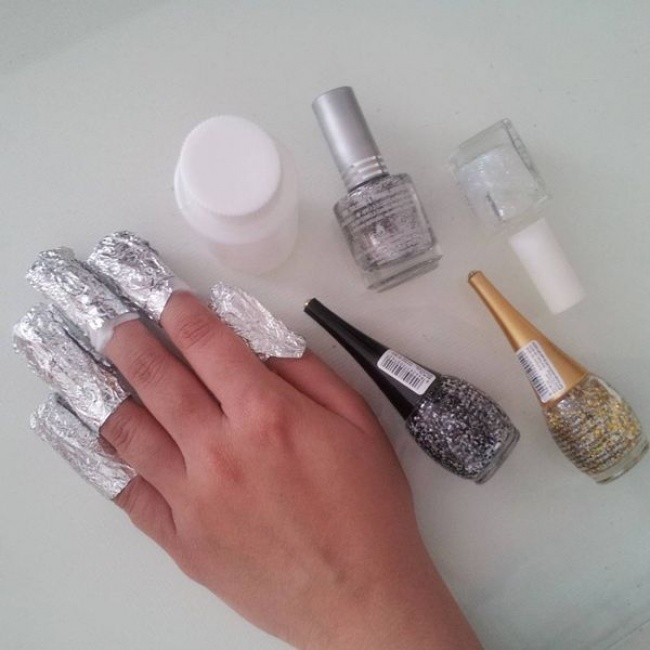 Щоб зняти лак з блискітками, змочіть ватний диск рідиною для зняття лаку, прикладіть до нігтям і обгорніть фольгою. Через 5 хвилин лак можна буде без проблем зняти.