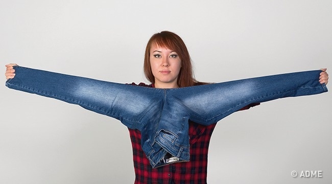 І нарешті, розберемося, чи підійдуть джинси по довжині? Візьміться за краї штанин і максимально широко розведіть руки в сторони. Якщо середина джинсів знаходиться прямо під вашим підборіддям — вітаємо, ви вибрали те, що треба!