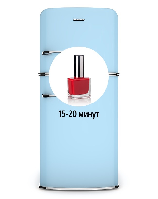 Щоб лак для нігтів лягав тонким шаром, не пузырился і швидше висихав, покладіть її на 15-20 хвилин у холодильник.