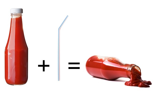 Щоб кетчуп швидше виливався з пляшки, занурте в неї коктейльну трубочку.