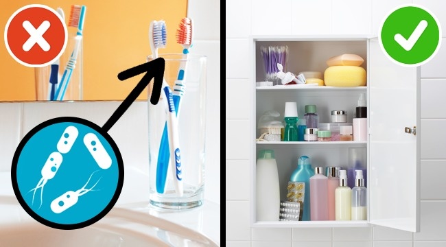 - Шафи і полиці у ванній кімнаті і туалеті: протирайте їх дезінфікуючим розчином, щоб убити мікроби, а зубні щітки краще зберігати в закритій шафі.