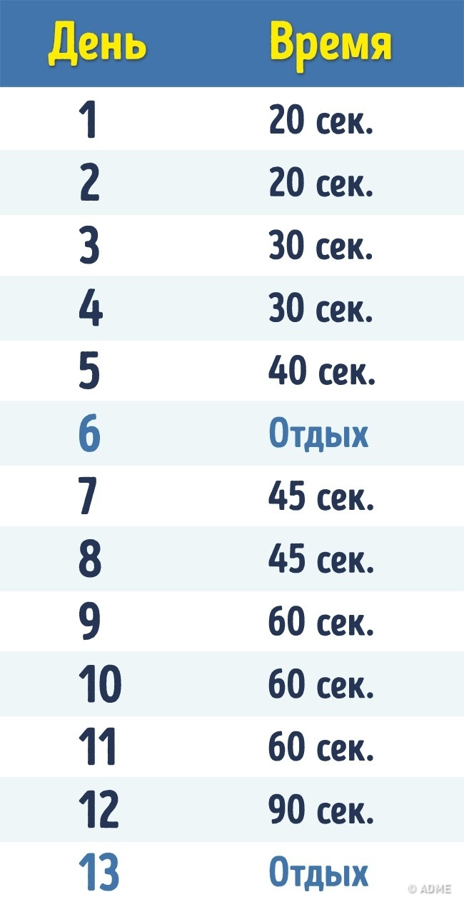 - Дихайте повільно і рівно. Правильне дихання збільшить час в планці і поліпшить результати.