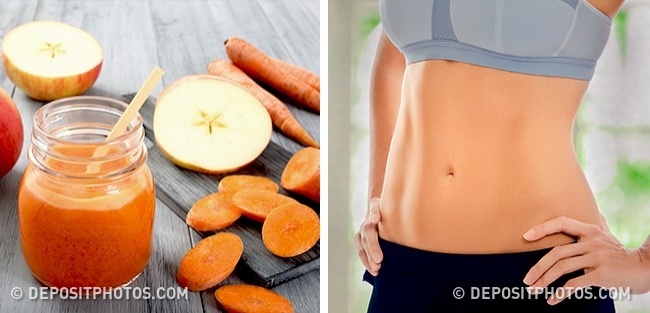 Тут ви можете вибрати один з декількох варіантів, які допоможуть прибрати зайве з області живота. Перший — морквяно-яблучний: 6 разів на день потрібно пити 200 мл соку з цих продуктів у співвідношенні 1:1. Вони не лише містять мало калорій, але і приносять користь: сік наситить ваш організм вітамінами, бета-каротином і пектином.
