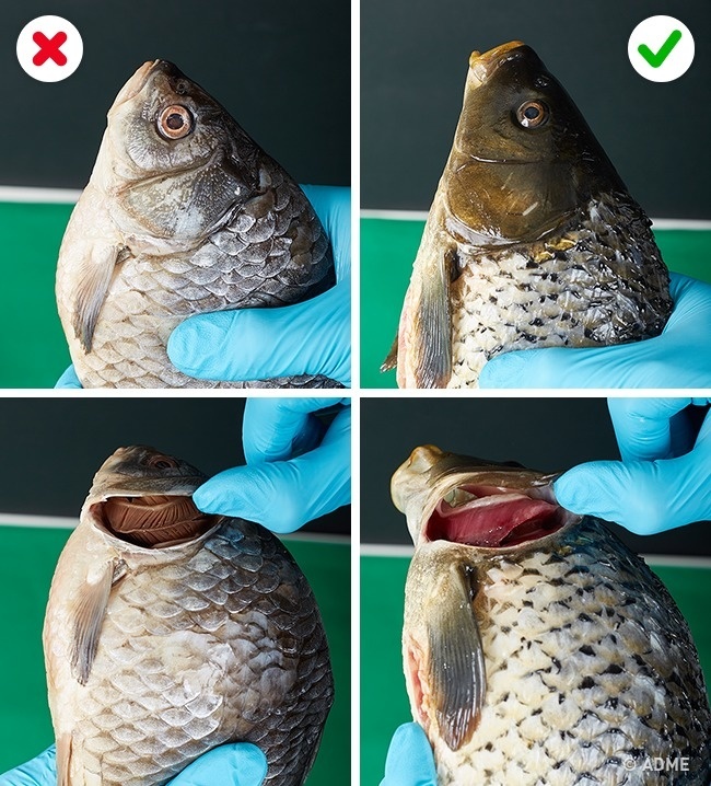 Як перевірити: У свіжої риби, яку можна безпечно приготувати, очі однорідного кольору, луска ціла, а зябра червонуваті. А в тієї, що лежала на прилавку довгий час, очі будуть блищати, луска місцями відходити, а зябра темні.