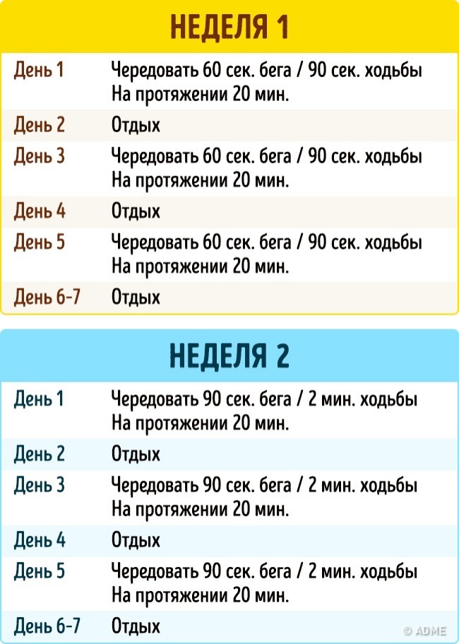 - Секрет програми полягає в чергуванні бігу і кроку, і з часом кількість секунд, відведених на біг, збільшується, а на ходьбу — зменшується.