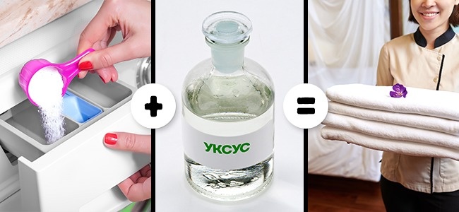 Замість кондиціонера, який накопичується і з часом робить рушники жорсткими, співробітники готелів використовують білий оцет. Додайте 100 мл при полосканні, щоб зробити білизна м'яким і уникнути слідів порошку.