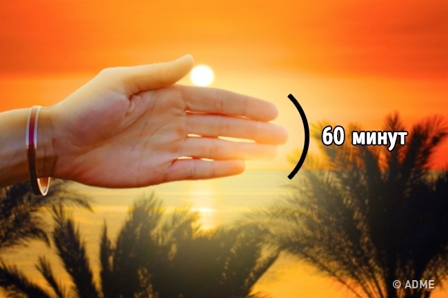 Складіть пальці разом і витягніть руку так, щоб сонце «лежало» на вказівному пальці. Тепер порахуйте кількість пальців до лінії горизонту. Кожен з пальців буде дорівнює приблизно 15 хвилин до заходу.