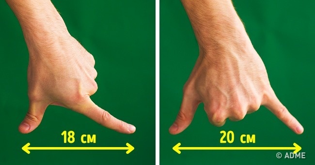 Звичайно, такий спосіб недостатньо точний, адже у кожного з нас різний розмір руки. Але він може бути корисний, якщо потрібно виміряти великий об'єкт, а у нас є тільки маленька лінійка: просто заздалегідь виміряйте відстань між пальцями.