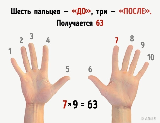 Щоб множити на 9, випрямити пальці, а руки покладіть долонями вниз. Тепер, щоб помножити будь-яке число на 9, просто загинаємо палець під номером цього числа. Пальці «до» позначають десятки, «після» — одиниці. Наприклад, щоб помножити 7, 9, загинаємо 7-й палець. Залишається 6 пальців «до» і 3 «після». Отримуємо відповідь: 7×9 = 63.